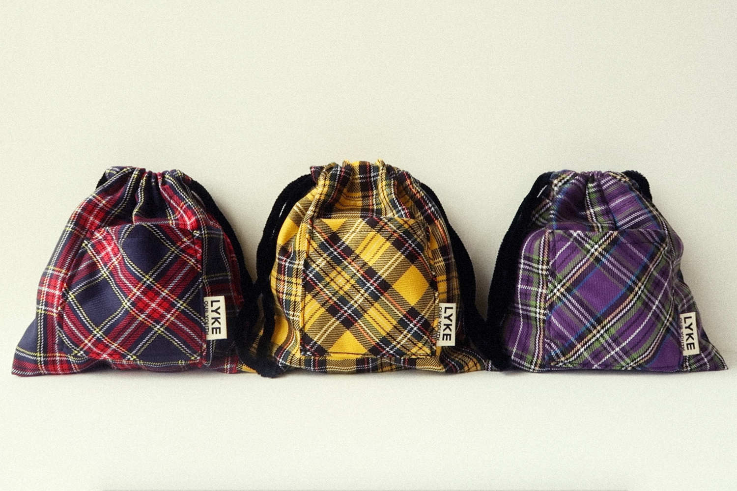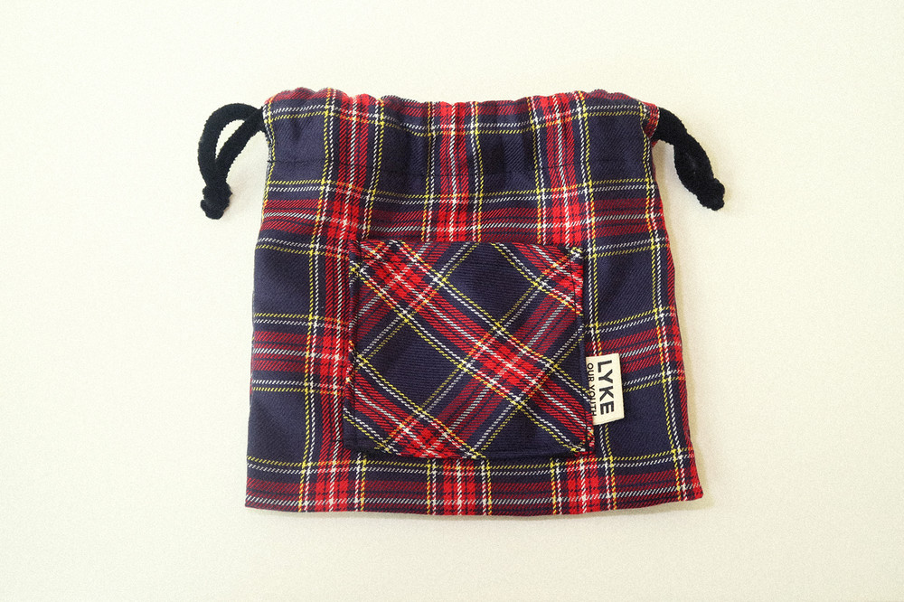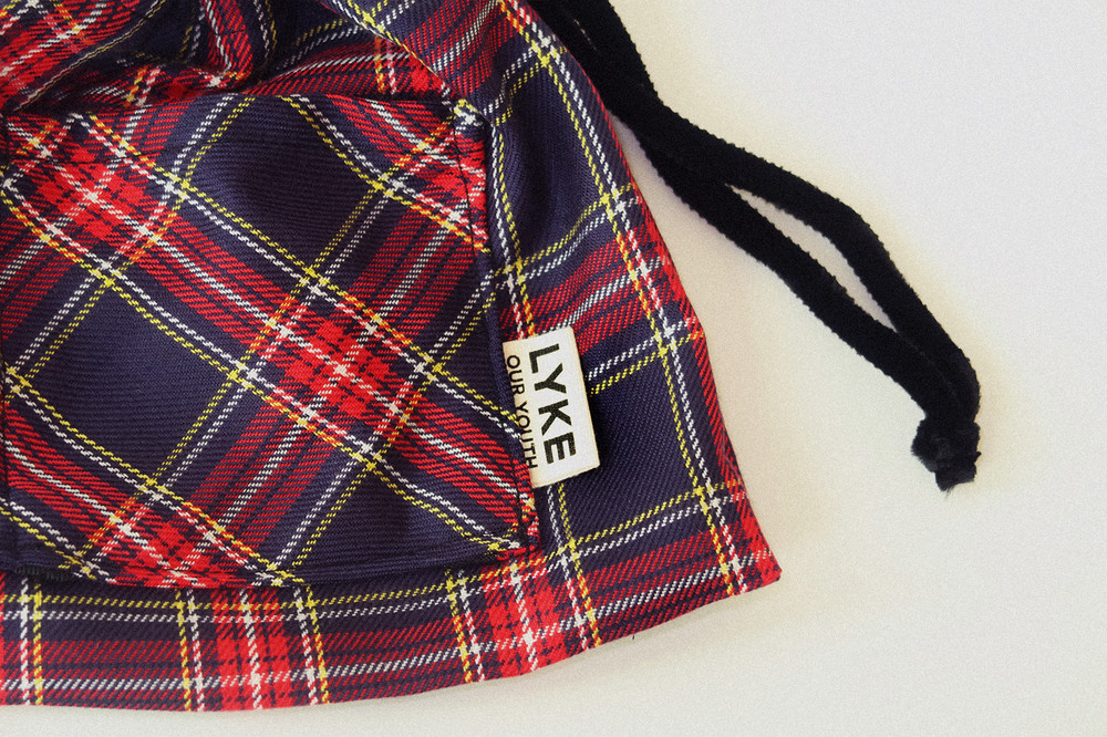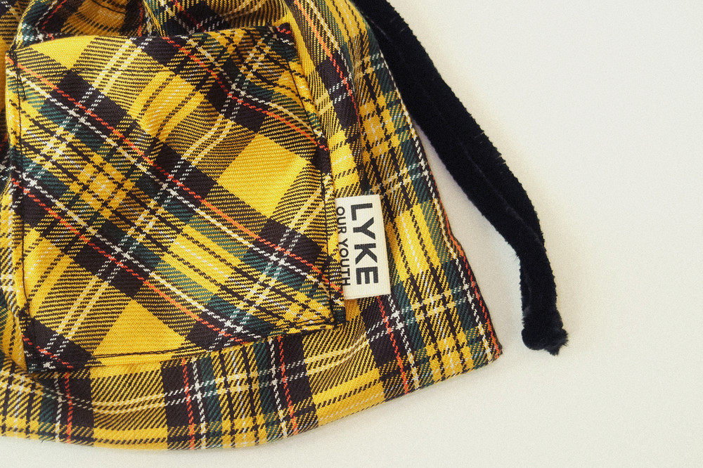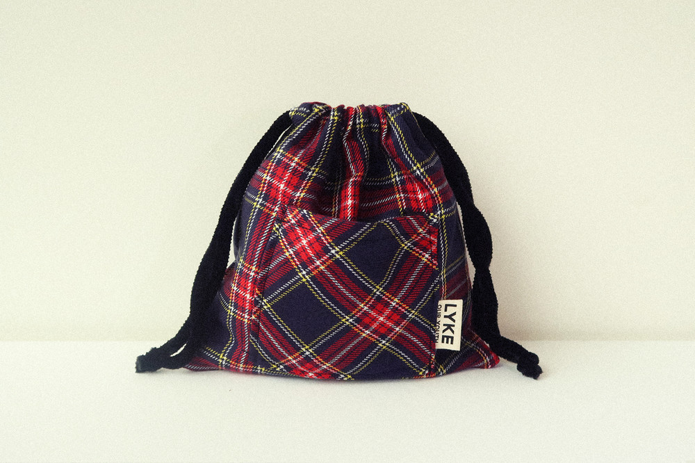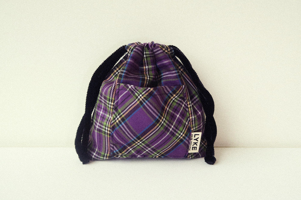 다양한 컬러의 타탄체크 소재 그리고 퍼 질감의 부드러운 스트링을 함께 매치 하였습니다.