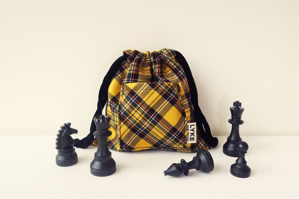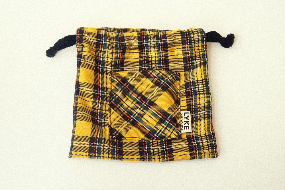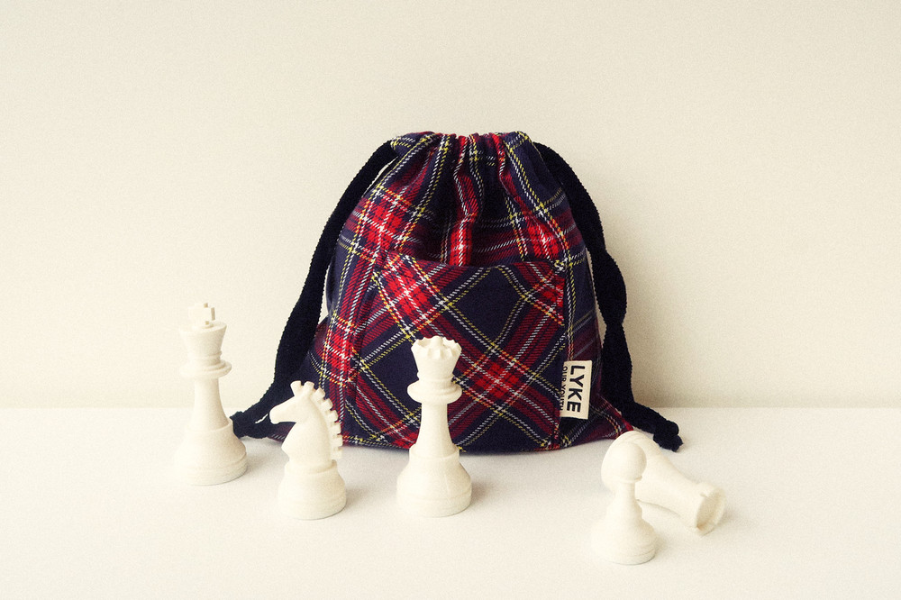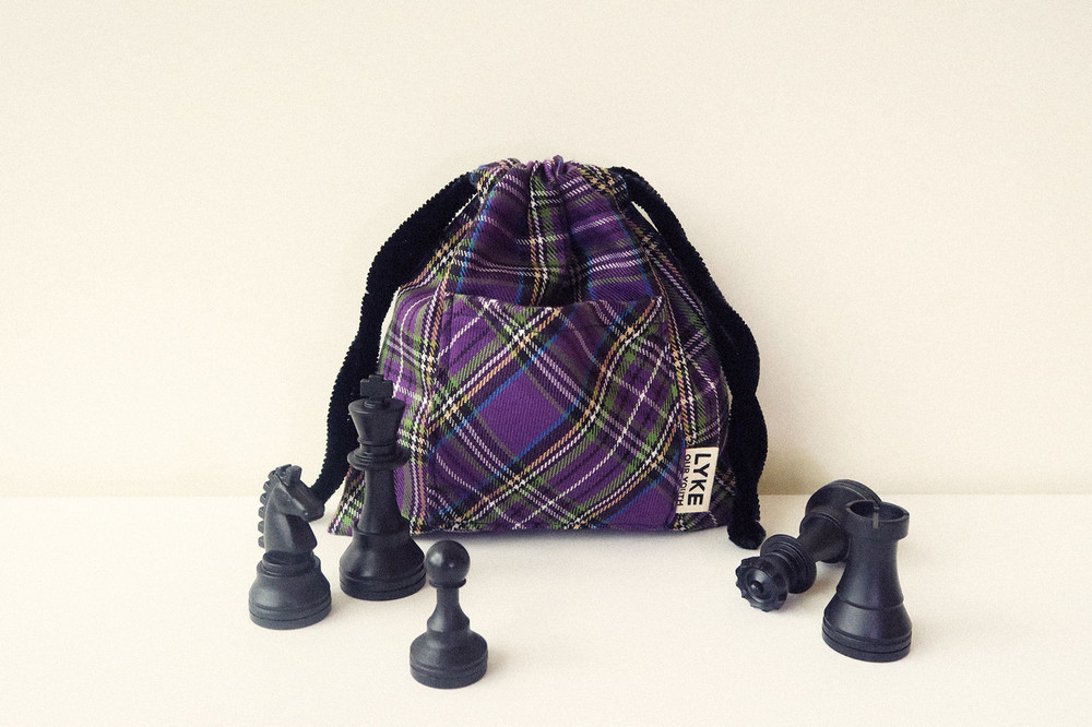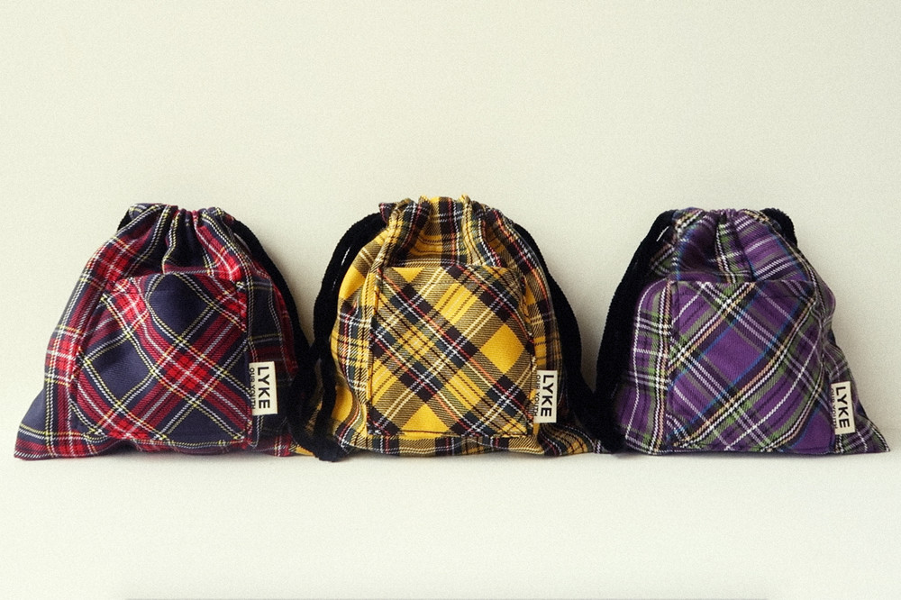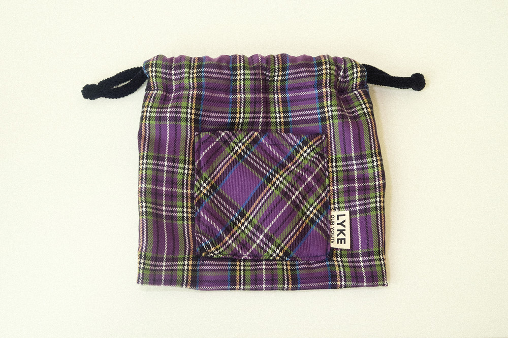 다양한 컬러의 타탄체크 소재 그리고 퍼 질감의 부드러운 스트링을 함께 매치 하였습니다.